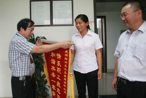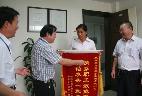 8月17日,家庭遭受火災(zāi)的供水公司分公司職工莫煜君在分公司負(fù)責(zé)人及村支書的陪同下來到集團(tuán)公司送上一面“情系職工救危困,和諧水務(wù)一家親”錦旗,感謝集團(tuán)工會(huì)對(duì)其的幫助。