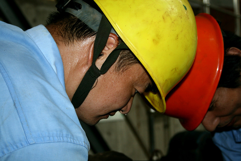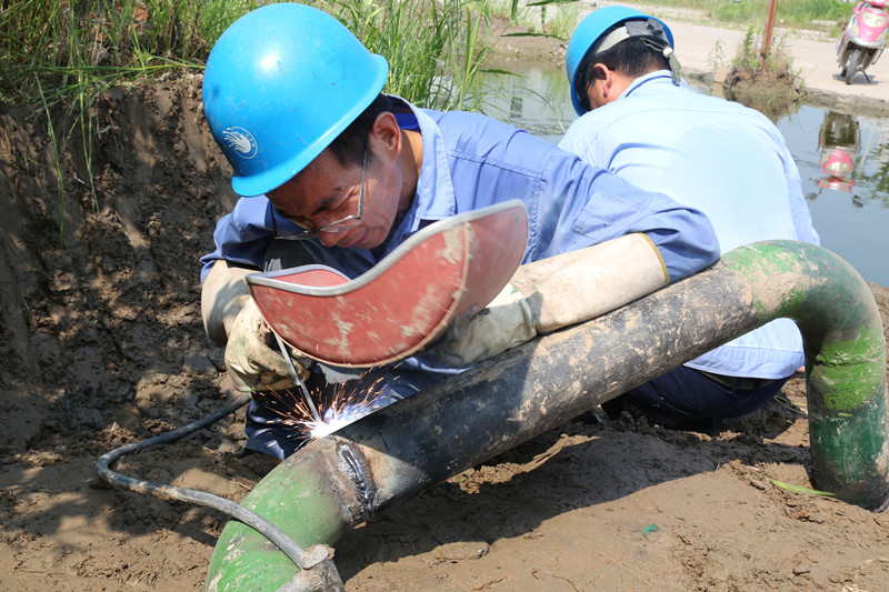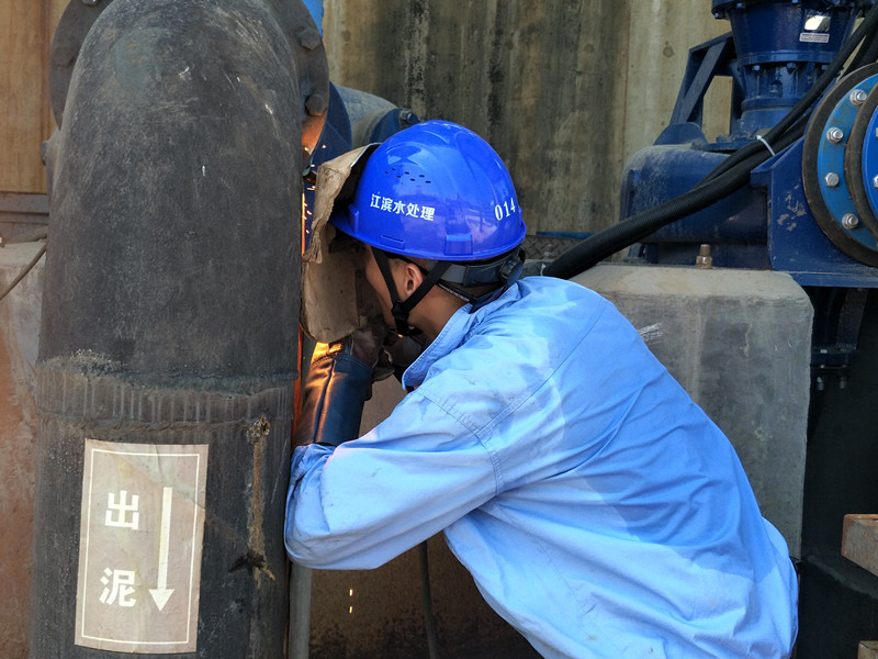江濱水處理公司設(shè)備部作業(yè)人員正對排泥管道進(jìn)行搶修焊接作業(yè),焊接時火花四濺,溫度可以達(dá)到140℃左右。