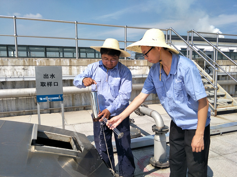 江濱水處理公司數(shù)米高的污水池上面,運行二部的兩名職工頂著烈日取樣。