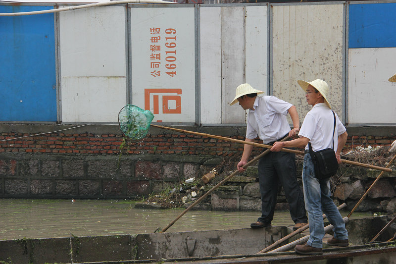 圖為志愿者們船上清理打撈漂浮在河面上的垃圾