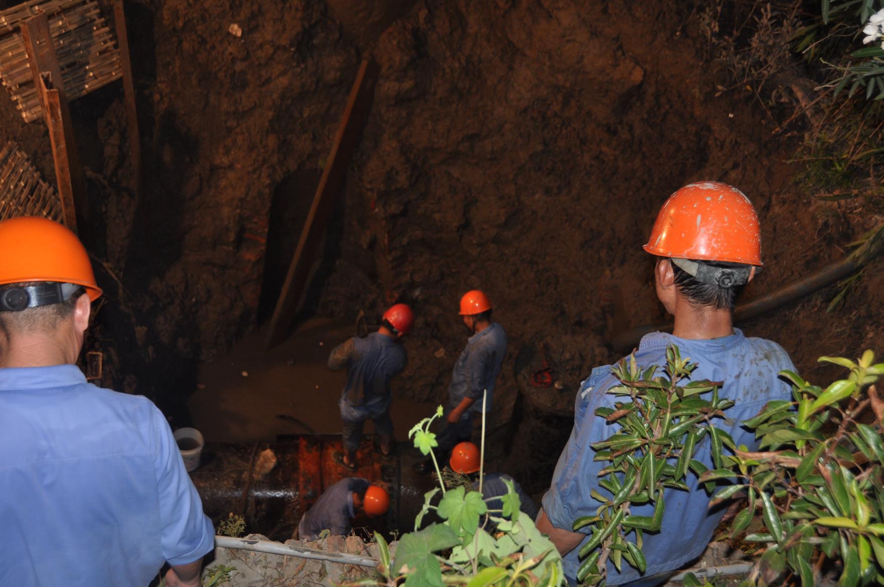 當(dāng)晚,雙臺風(fēng)余威尚未盡興,尤其是后半夜受其余威影響陡然而至的暴雨,扎扎實實地落在搶修人員的臉上和身上,早已分不清是雨水還是汗水。暴雨過后的夜晚,頻頻騷擾的蚊蟲,更是將搶修人員裸露在外的脖子和手臂上留下密密麻麻的痕跡。被應(yīng)急燈照得燈火通明的搶修現(xiàn)場,大伙兒雖然身軀疲憊,卻始終斗志高昂,雖然各個渾身濕透沾滿污泥,卻不曾有過半句怨言。為盡快恢復(fù)正常供水,這些搶修“衛(wèi)士”與時間賽跑,分秒必爭,堅持、再堅持……